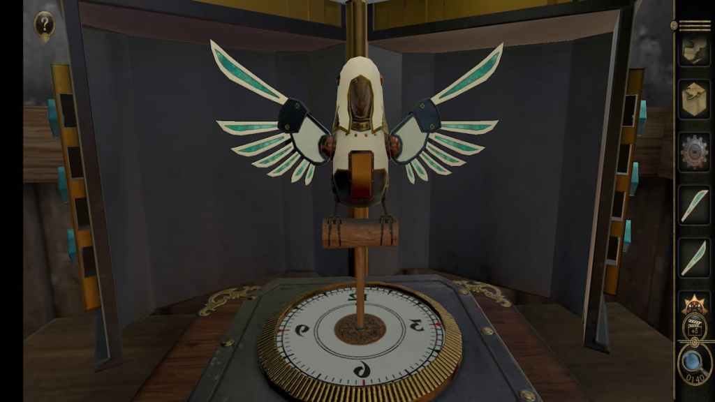 Now head over to the bird. There are two missing slots, one on the left wing and one on the right. Insert the two pieces from the navigation room to start the puzzle.