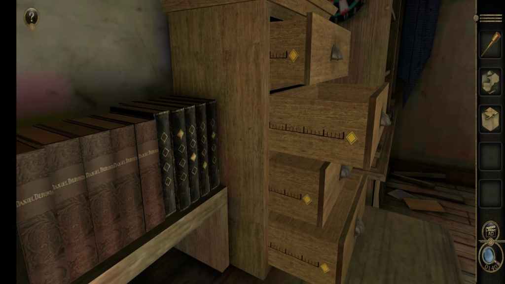 Head to the set of drawers on the right side of the desk. You'll notice that the set of books beside it has an interesting diamond pattern. To solve the puzzle, you'll need to use the books as a guide for pulling each drawer out.