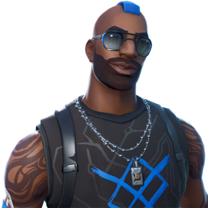 The skin depicts what could be a vigilante that appears to be really into anarchy. This is depicted by the shirt design with the anarchy-esque symbol on it. The kind also features blue hair which is kind of a rarity, and some pretty wild tattoos on both arms.