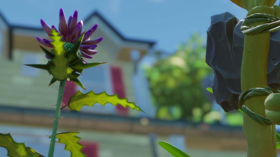 To get Thistle in Grounded, you must find a Thistle Plant. Look for a tall stalk with a purple flower at the top. Once you locate one, approach the stalk and remove the needles going up it; you do not need an axe to get Thistle Needles from the plant. I've marked a location below where I found some Thistle plants.