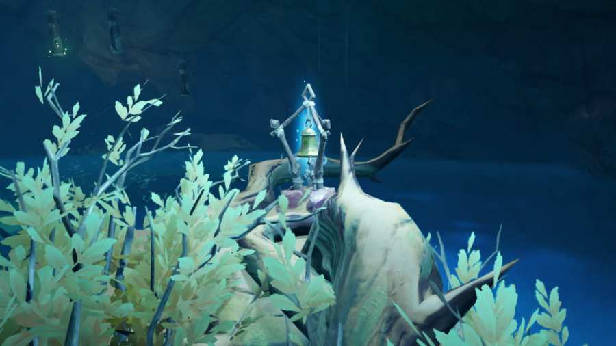 Use the Four-Leaf Sigil to propel yourself to the other side, where the blue bell is waiting. Interact with it to begin the Trial of Submerged Waves. It consists of three challenges that involve collecting Dendro Particles with the help of a Special Four-Leaf Sigil.