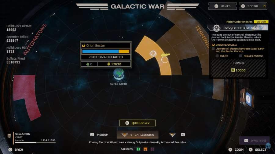 The main menu in Helldivers 2 is called Galactic War Screen, and there, you can see the difficulty setting option at the bottom of the screen. When you choose the planet and get the mission resume, you can also select your difficulty.