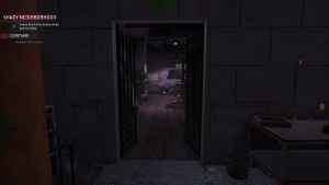 - From where you found the body, follow the pathway until you see a white door on your left.