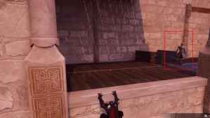 Afterward, you will want to follow the path laid out by the image below and take out the guard marked by the red box. Kill or silently take out the guard and then find a white pillar to the north.