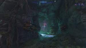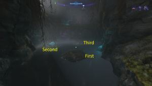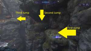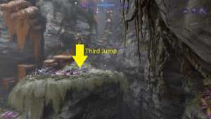 Upon entering the cave, there will be three small platforms. Hop onto them, and once you get onto the third platform, look to your left, and you should see a small cove. Go to the small cove and keep walking forward; you should now be at a slightly elevated area of the cave.