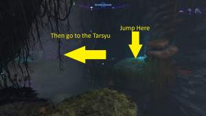 Jump onto the next platform right across from you and walk toward the Tarsyu.