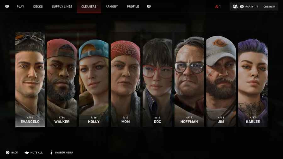 Evangelo, Walker, Holly, and Mom are automatically unlocked when players start the game, but to unlock Doc, Jim, Hoffman, and Karlee, players need to complete the first four chapters of Act 1. Once players beat Act 1-4: The Crossing, each of the previously locked characters is available for selection in the game's main menu.