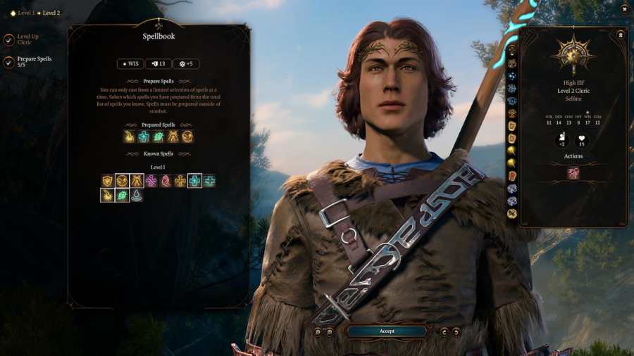 Here is my progression for the Tempest Domain Cleric. The list of prepared spells isn't really important since you can change them in between fights. I made a list of recommended spells, but feel free to change it according to the map locations and your preferred playstyle.