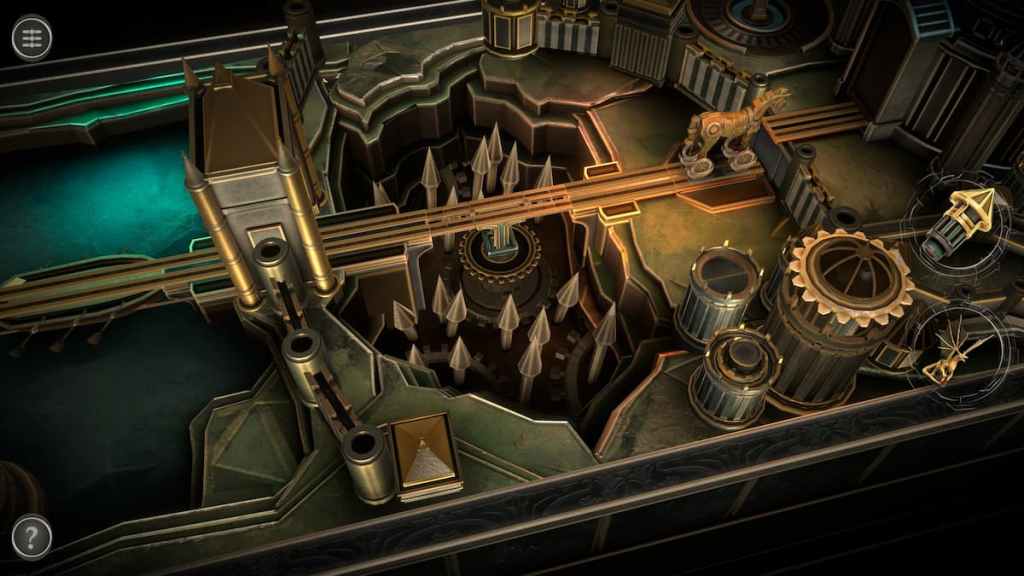 The tricky part comes when you're ready to push it towards the center, but the blue mobile pathway is still at the start. To get past this section, start by dropping the gear as far down as it can go.