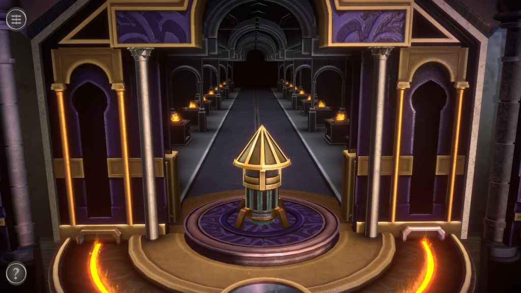 Lighting the fire opens up a hallway behind the mask and displays a tiny statue on a toothed platform. This puzzle is unlike any other in the game, acting as an intense game of red light, green light.
