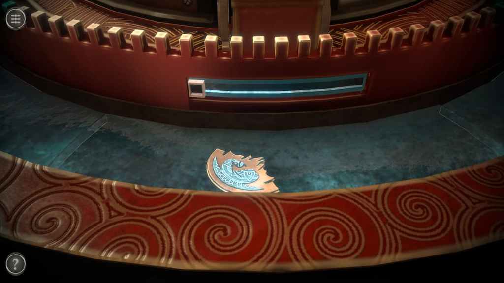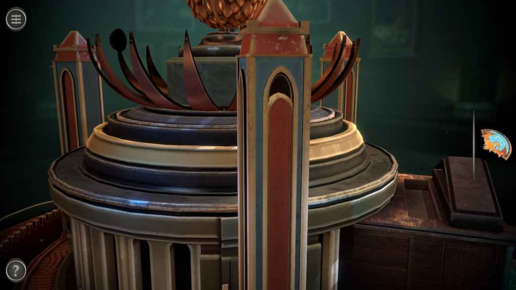 Rotate the camera to view the back of the table. There is a small slider next to an item stuck beneath the glass. Pull the slider to move the glass and get an Ornament Piece.
