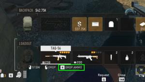 - Drop ammo: Open your backpack and hover over your weapon. There will be a Drop Ammo option, as shown in the second image. Press the input for it multiple times until you have no ammo left.