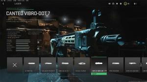 The final attachment on our list is the Canted Vibro-Dot 7, which lets you ADS from the Laser itself, as shown in the second image. Although the Laser is visible at all times, it offers aiming stability, aim-down-sight (ADS) speed, and sprint-to-fire speed to the weapon. The Canted Laser is available for limited weapon classes such as ARs, LMGs, and Marksman Rifles. Use this highly-accurate attachment if you don't like the weapon's iron sight and want a clutter-free view of the target.