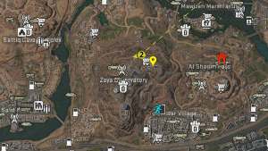 Jump off the cliff of Zaya Observatory towards the Akhdar Village POI to your southeast. Using your parachute, glide over to the location marked on the map above, next to the Akhdar statue. Land next to the dead drop shown in the second image and do the same thing with the laptop you did earlier. Put it into the dead drop and pick it back up immediately.