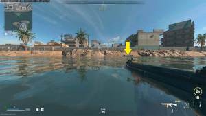 First of all, you'll need to acquire an RHIB boat, which can be found in the river next to Sa'id City or nearby POIs like Hafid Port and Sawah Village. Bring the boat to the area highlighted by the yellow line in the first image. All you have to do here is park the boat off the shore by the boundary wall, as shown in the second and third images.