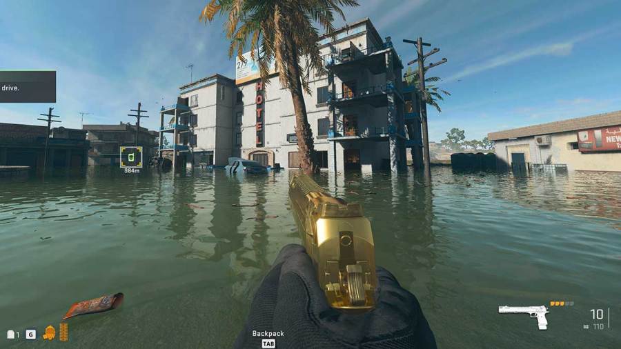 As mentioned in the mission's description, the golden .50 GS can be found in Room 302 of the Sawah Hotel. This building is located in the center of Sawah Village, in the southwestern region of Al Mazrah, as marked in the map above. Take the elevator or stairs to reach the top floor and open Room 302 using its key. Also, make sure to exfil successfully with the gun for the mission progress to count. The gun isn't that good in my opinion, but you can store it in your contraband stash for later use.
