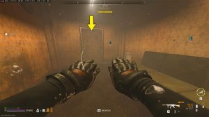 Once on top, you'll be in a small chamber with a yellow bunker door. Approach the panel next to the door and place the Barracks Exit Keys A and B there. This will unlock the shortcut route to the Factory Admin, where you can access the Shopkeeper and Weapon Case.
