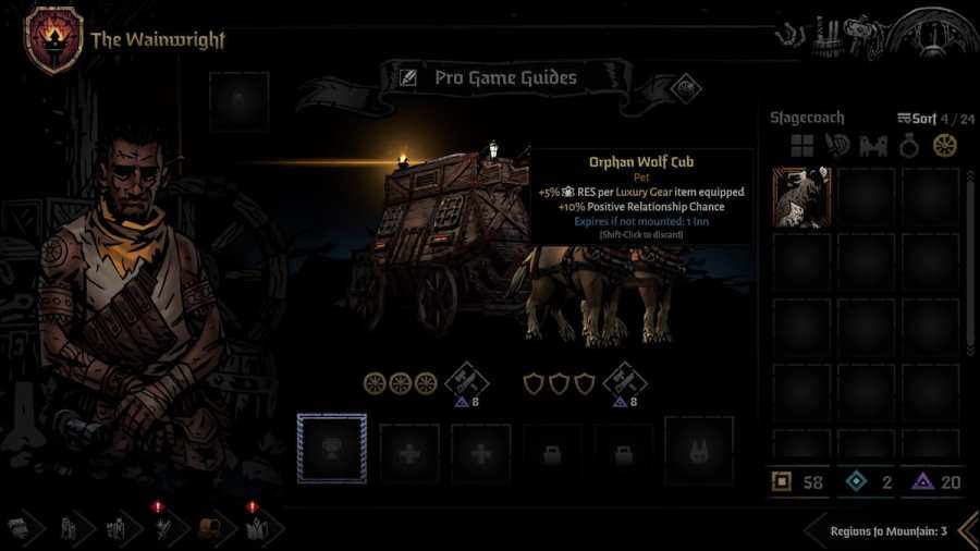 As you can see in the image above, you can equip the stagecoach with four items, one pet and a trophy (Lair boss head). There is plenty to experiment with, so you can find the right combination to help you survive the dark and desolate world of Darkest Dungeon 2.
