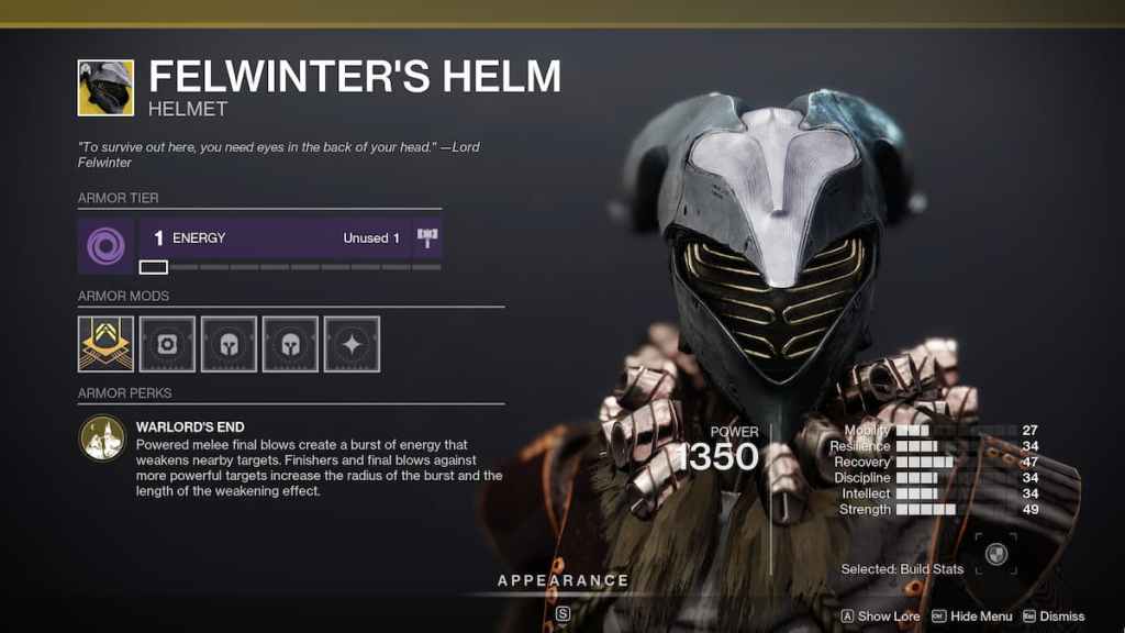 While Felwinter's Helm does get points for looking like The Hunter from Bloodborne when viewed head-on, its perk is underwhelming. This helmet's powered melee final blows create a burst that weakens nearby targets. Finishers and final blows against powerful opponents increase the radius of the burst, as well as the length of the weakening effect.