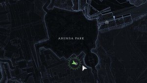 Directly south of where it says Ahimsa Park on the map will be a building with a yellow wall and a moving billboard on the front. Looking around on the right side will reveal a depressed awning. Jump up there and across to the next awning for the final chest.