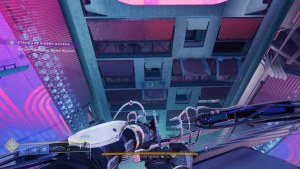 Zip back up to Strider's Gate for a quicker route to Zephyr Concourse. Instead of heading East, you'll now be going West. Immediately upon reaching the concourse, stop and look to your left. There will be a large building that you can go into. Head up to the second-floor balcony and you'll see a Neomuna citizen who can give you a quest. Ignore them and jump onto the awning behind them. Turn around and jump on the large red outcropping and run to the top to find the chest.