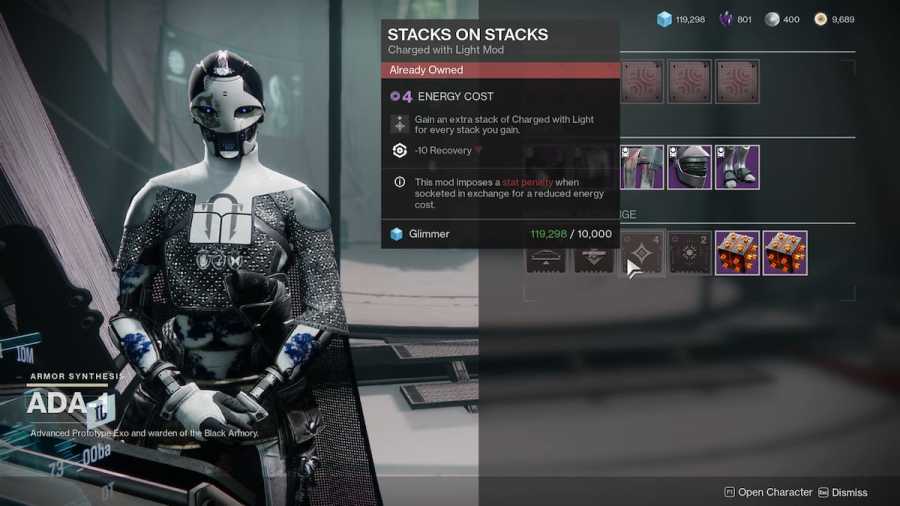 Stacks on Stacks is a universal Void mod. This means it can be slotted into any piece of armor with the Void affinity. When equipped, Guardians will gain an extra stack of Charged with Light for every stack that is gained. However, this imposes a -10 Recovery penalty.
