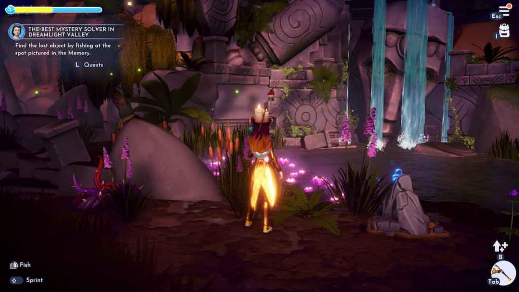 Once you start The Best Mystery Solver in Dreamlight Valley, examine a Page from the Journal. You can access it by pressing I for the inventory. The page will reveal a Memory where you will see a fishing hat by the pond. Talk to Belle and with that, you will be tasked to find this lost object (fishing hat) at the spot pictured in the Memory.