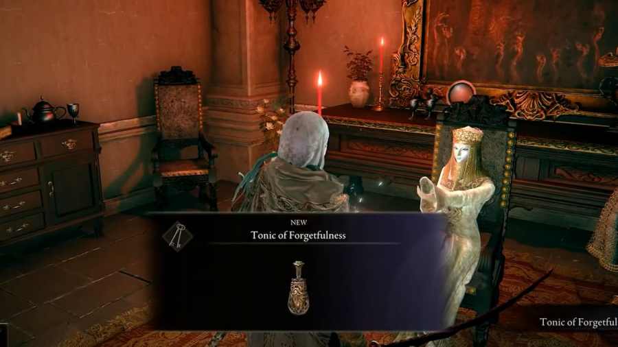 Players will receive the Tonic of Forgetfulness from Lady Tanith at the Volcano Manor, but first, they must advance her questline. To reach the Volcano Manor players need to start Rya's quest in Liurnia. She'll be at the Scenic Isle on the southern end of the territory in the pavilion near the Bird's Eye Telescope. This will require the player to collect her necklace from the Blackguard Big Bogart, not far from Rya at the Boilprawn Shack. When players return to her there, she'll gift the player an invitation to Volcano Manor to see Lady Tanith.