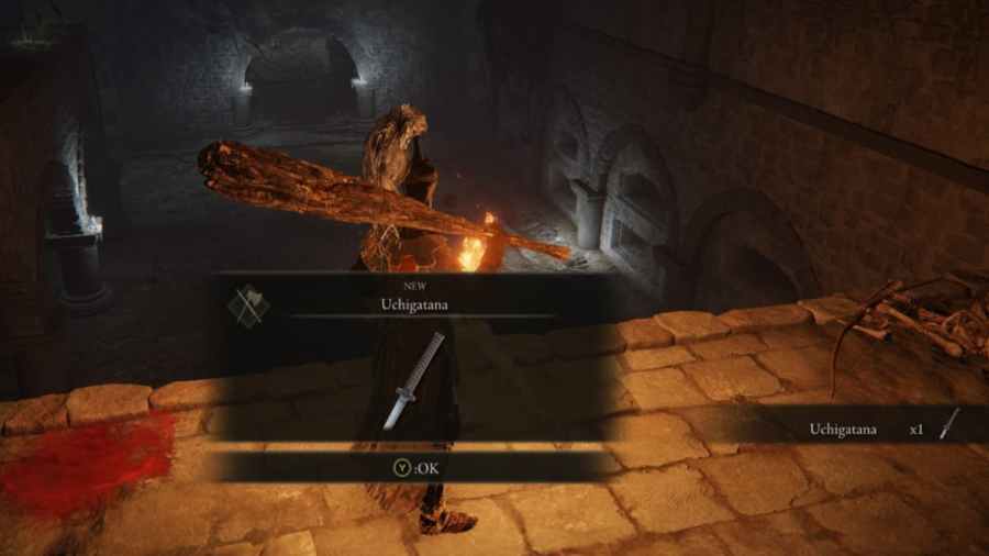 Near the skeletons, there will be a lootable corpse. Loot the corpse, and you will get the Uchigatana Sword in Elden Ring. The Uchigatana Sword has a Physical attack of 115+ 34.