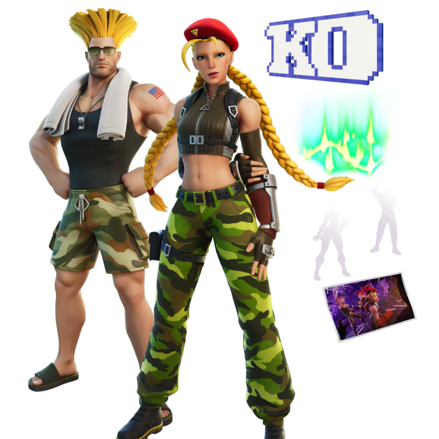 Cammy & Guile Bundle is a Gaming Legends Fortnite Bundle. It was released on August 8th, 2021 and was last available 1208 days ago. It can be purchased from the Item Shop for 2,200 V-Bucks when listed. Cammy & Guile Bundle was first added to the game in Fortnite Chapter 2 Season 7.