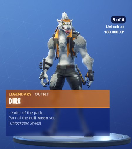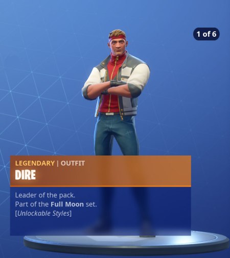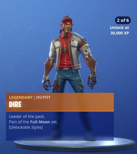 The Dire Skin is a Legendary Fortnite Outfit from the Full Moon set. Dire was available via the Battle Pass during Season 6 and could be unlocked at Tier 100.
