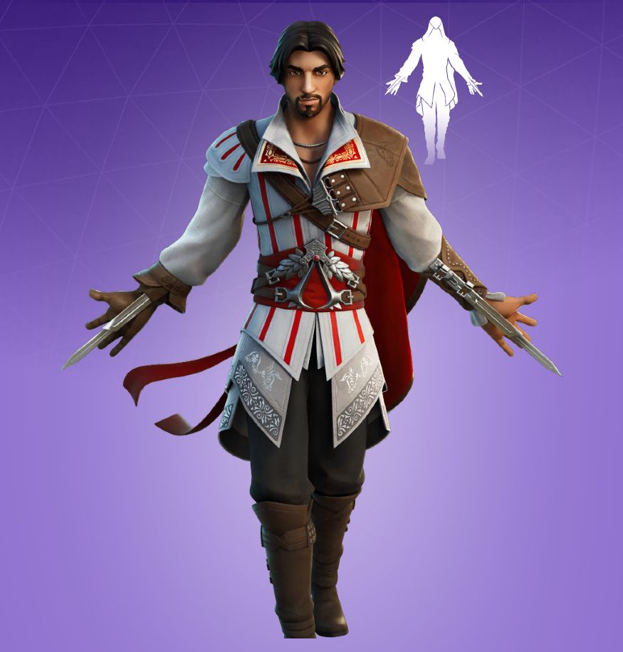 The Ezio Auditore Skin is a Gaming Legends Fortnite Outfit from the Tales from the Animus set. It was released on April 8th, 2022 and was last available 981 days ago. It can be purchased from the Item Shop for 1,800 V-Bucks when listed. Ezio Auditore was first added to the game in Fortnite Chapter 2 Season 9.