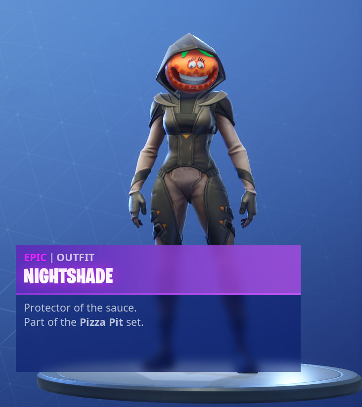 The Nightshade Skin is an Epic Fortnite Outfit from the Pizza Pit set. Nightshade was available via the Battle Pass during Season 6 and could be unlocked at Tier 86.