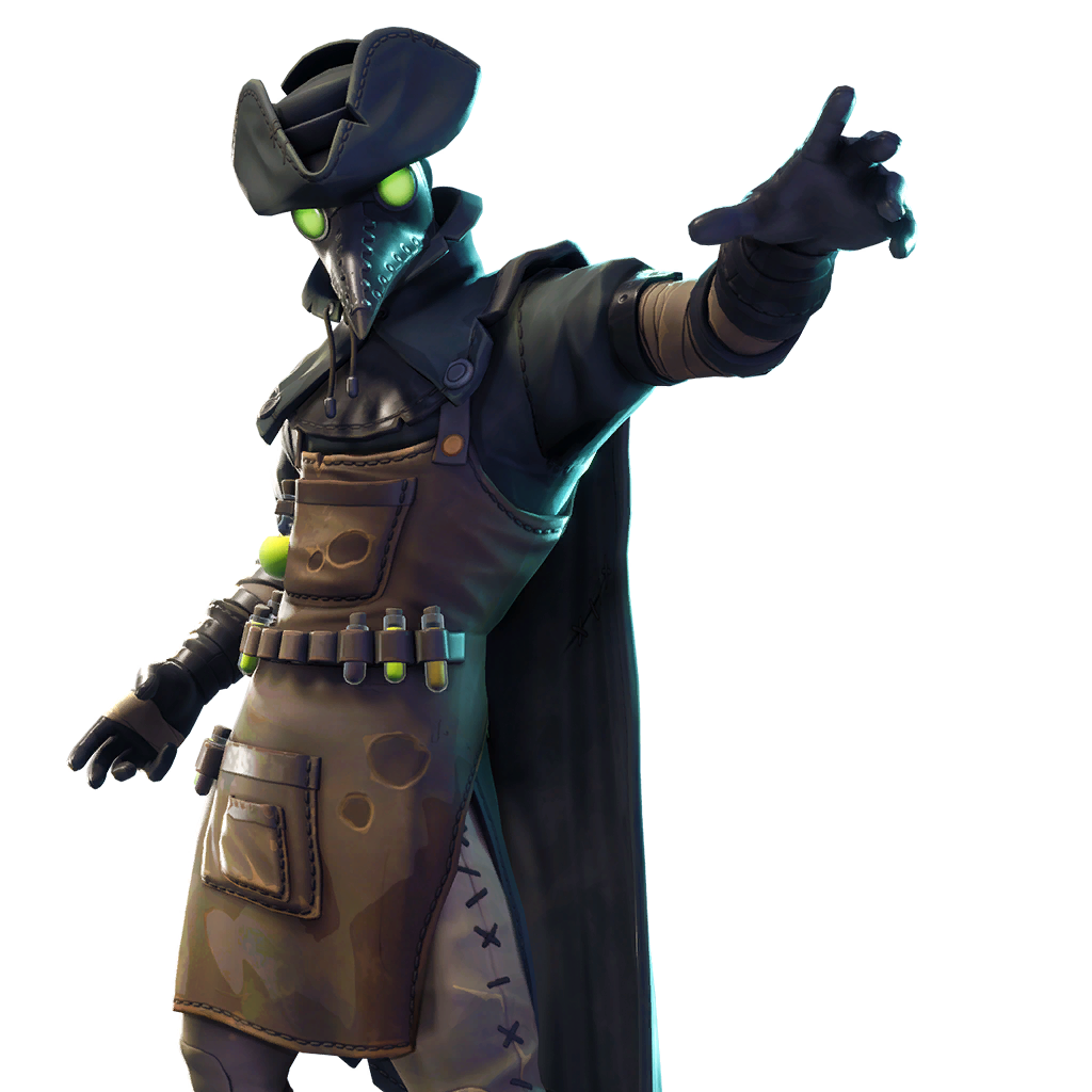 The Plague Skin is an Epic Fortnite Outfit from the Grim Medicine set. It was released on October 12th, 2018 and was last available 239 days ago. It can be purchased from the Item Shop for 1,500 V-Bucks when listed. Plague was first added to the game in Fortnite Chapter 1 Season 6.