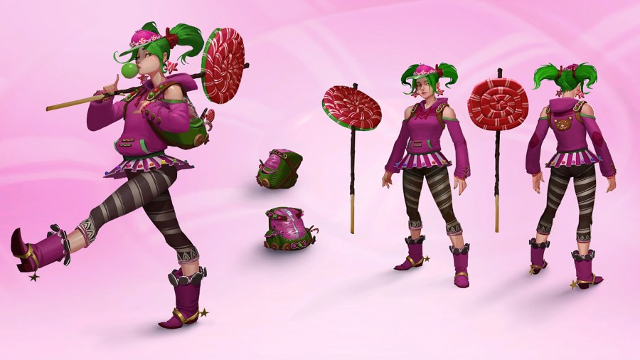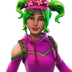 The Zoey skin is part of the season 4 battle pass. It's pretty off-theme, most of the skins are superhero based, but this one is apparently inspired by a character from Wreck-It Ralph. Has a similar coloring to Cuddle Team Leader with the heavy pink, but also features the bright green pigtails.