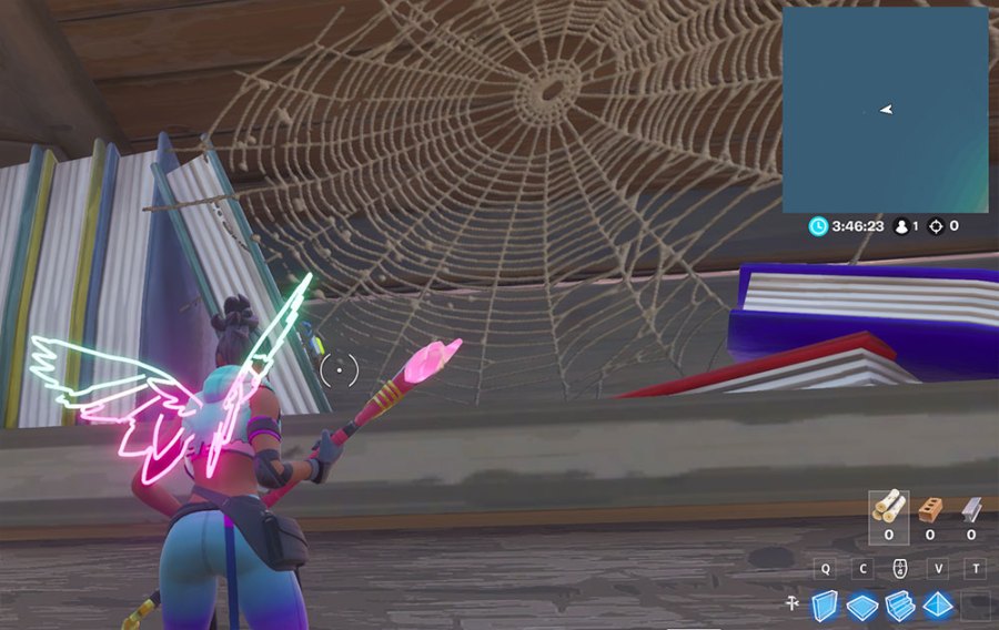 Behind the web you will find a button, make sure to press it which will trigger a clue to the next web. Jump through the web and glide towards the table with the "Hub by Gur4anov" text on it. Go to the right and on the side of the blue chest is the second spider web. Go behind it and hit the button.