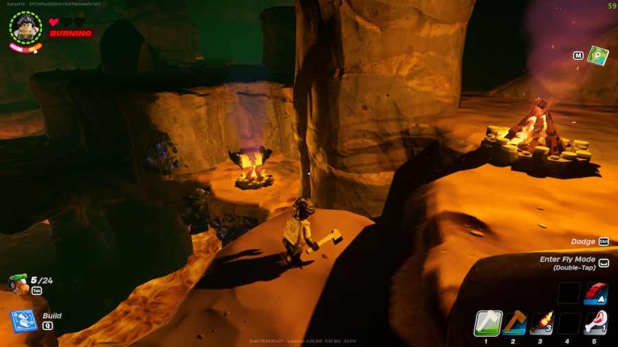 Obsidian usually spawns inside the caves of the LEGO Fortnite universe, especially the ones in the desert region. So, after hopping inside your universe, explore until you find a cave in the desert region. Once found, craft a couple of Snowberry juices and consume them to provide heat resistance. Explore the cave area, and you will locate the Obisidian ores sticking to the terrain near lava areas. They are black in appearance with a purple tint over them.