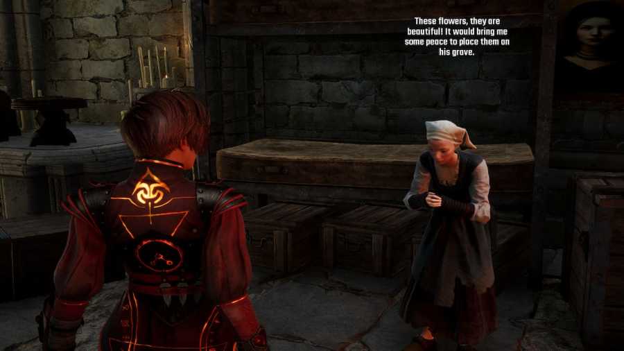 The initial conversation with her will explain that she is looking for a nice way to mourn the loss of her loved ones and wants to bring some flowers to their grave. You'll need to collect three beautiful flowers for her, but you won't be able to find any flowers in Locksley. After this conversation, you can find her again in the Major Oak HQ, in the room just to the right of the Mission table.