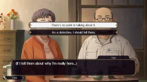 Now you are by the detective's childhood home, you will need to interact with the cabbage patch and truck a few times to find someone to talk to. Once you are at the house, you will need to interact with the window, the door, the mailbox, the clothesline, the grass, and try to call out a couple of times with Call/Engage. A neighbor will hear you and come to help. Tell Tayama the truth by choosing "(I'll be honest and say who I am.)"
