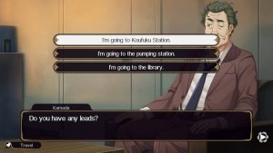 After visiting the police station, you will get to chat with Kamada. Tell him "I'm going to Koufuku Station." Once you meet up with Kamihara, he will ask you a quiz question. The answer is "Working separately today and you're meeting up later." During the review at the end of the chapter, the answers will be: