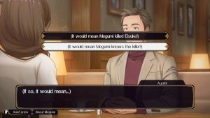 Next up is Ayumi's chat with Fukuyama at the coffee shop. Keep pushing the teacher to disclose information about Megumi and why she was missing from school. Choose the "(It would mean Megumi knows the killer!)" answer. Once back at the Utsugi Agency, review your notes with Ayumi, and choose these answers: