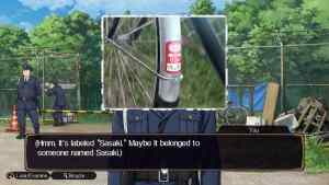 The next day, Dice will pick you up from the Agency to drive you to the police station before you can head back to the library. He will ask you a single question, and the correct answer is "While we were still talking at the bus stop." It will take a lot of Asking/Listening and Look/Observing and Think button presses to get through the car ride to the station, but keep clicking through the menus until you pull up to the station. After Kuze grills you, you will be called into a meeting. Once it is over, you will review you own notes on the forensics of the bag. Here are the two answers needed: