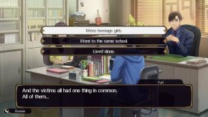 When talking to Fukuyama, if you get stuck, make sure to Look/Observe his face, and make sure to think about his connections to his students. While at the car shop in Kamematsu, you will also need to Look/Observe Mr. Todoroki's face to keep him talking. You will get the option to tell the Todorokis about the murder, but you should choose: "There's no point in talking about it." When you return to the Agency, the answers to the review are: