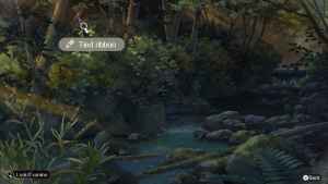 At Yamanba Pass, there will be some tracks going up into the mountains. Follow them, then keep following the tracks deeper into the forest. Look carefully at the trampled plants to keep following the footprints, then take the Road to the Left. At the next intersection, follow the Road to the Left. Make sure to look at the Ribbon tied to the tree, then head in that direction across the water.
