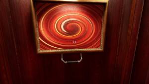 Once you have selected one of the puzzles to start with, line up the dial to make an orange line, then back out of the map. Face the shelves of library books, and pull the lever under the painting of the open door. This will cause the door to the outside to close, and the door to the tower to open. Head deeper into the library, and you will find an elevator. Go into it, close the door behind you, then press the green button to ride up into the tower. If you don't close the door behind you, the elevator won't work.