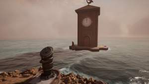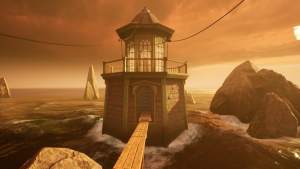 To get back to Myst Island now that you have both pages, you will need to get into top of the lighthouse. First, you want to go to the top of the island look through the telescope. Look through the lens, and find the lighthouse. It will be 135 degrees (Randomized); take note of the number. Go back to the control panel, move the lever to the right, then press the button to empty out the lighthouse of water. Go into the lighthouse, then descend down the stairs inside. There will be a barrel at the bottom of the stairs with a valve in it; open the valve to empty the barrel of water, then close it again to make it air tight. This will allow the barrel to float when you refill the room back up with water.