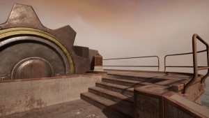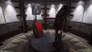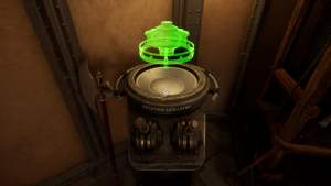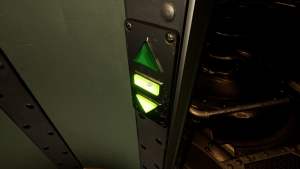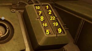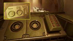 Head down into the brick building with stairs. At the bottom of these stairs is a closed door; hit the green button next to it to open it up. Once inside, you will see a console with two dials on it and 10 buttons. When you press each of these buttons, the numbers inside the dials will go up a specific amount. If you check out the last image in the gallery above, you will see the specific numbers for each button. Push the buttons to add up to the number of volts from the plaque inside the tower. If you go over the number, the Power to Ship dial will be stuck at zero no matter what you press.