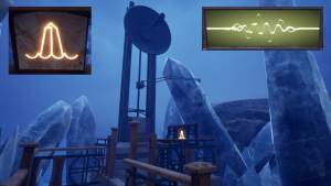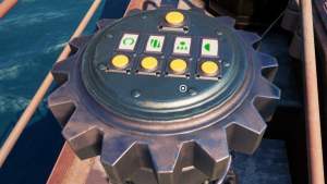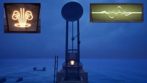 Climb up this ladder, then look at the mechanism on this island. There are several radars pointing out, and a panel at the bottom that controls the direction each radar points. Open up the panel and look at the buttons. Press the first button so the water symbol is lit up, then move the arrow buttons left and right until the water sound lines up with the radar that is above the water sound. You will see the sound pattern fill in as you get closer; keep in mind this will not work if you haven't pushed the button by the water radar to light up the water radar sign.
