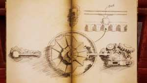 Open the linking book inside the giant gear, and click the picture on the inside. You will find yourself in a new world. This island is pretty small; you have a gear-shaped building, a little puzzle stand on the left, and another unreachable island off to the right of the screen. Head into the gear-shaped building. If you choose the left route inside the building, you will see Sirrus' Room and if you go right, you will find Achenar's Room.