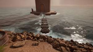 There are several places of interest in the Stoneship Age. There are three flooded doorways, the lighthouse, the top of the island, and a control panel under an umbrella. First thing you want to do is to go to the control panel, and pull the level down into the center position, then press the button on the left. This will empty the water out of both brothers' rooms so you can look for the pages inside of each one.